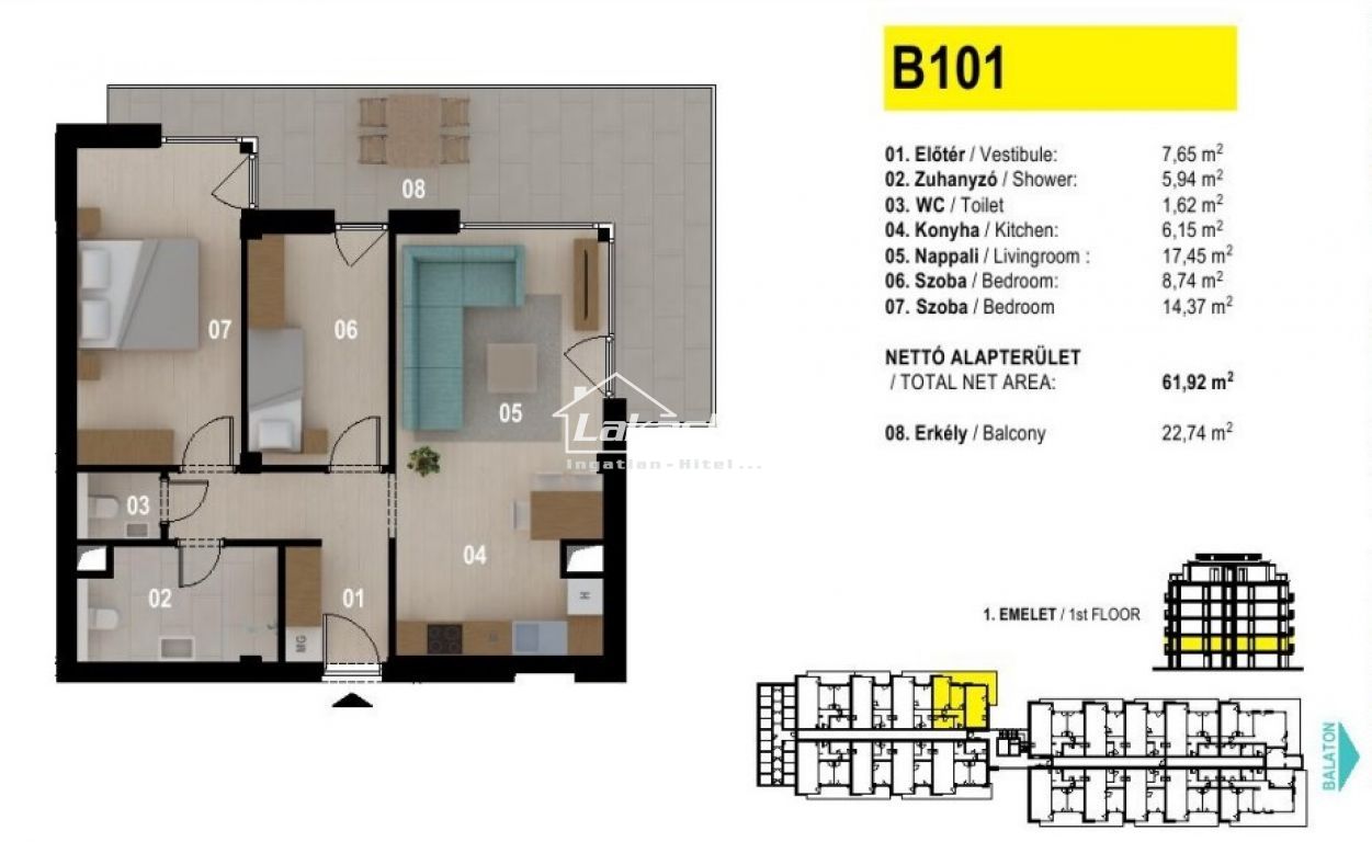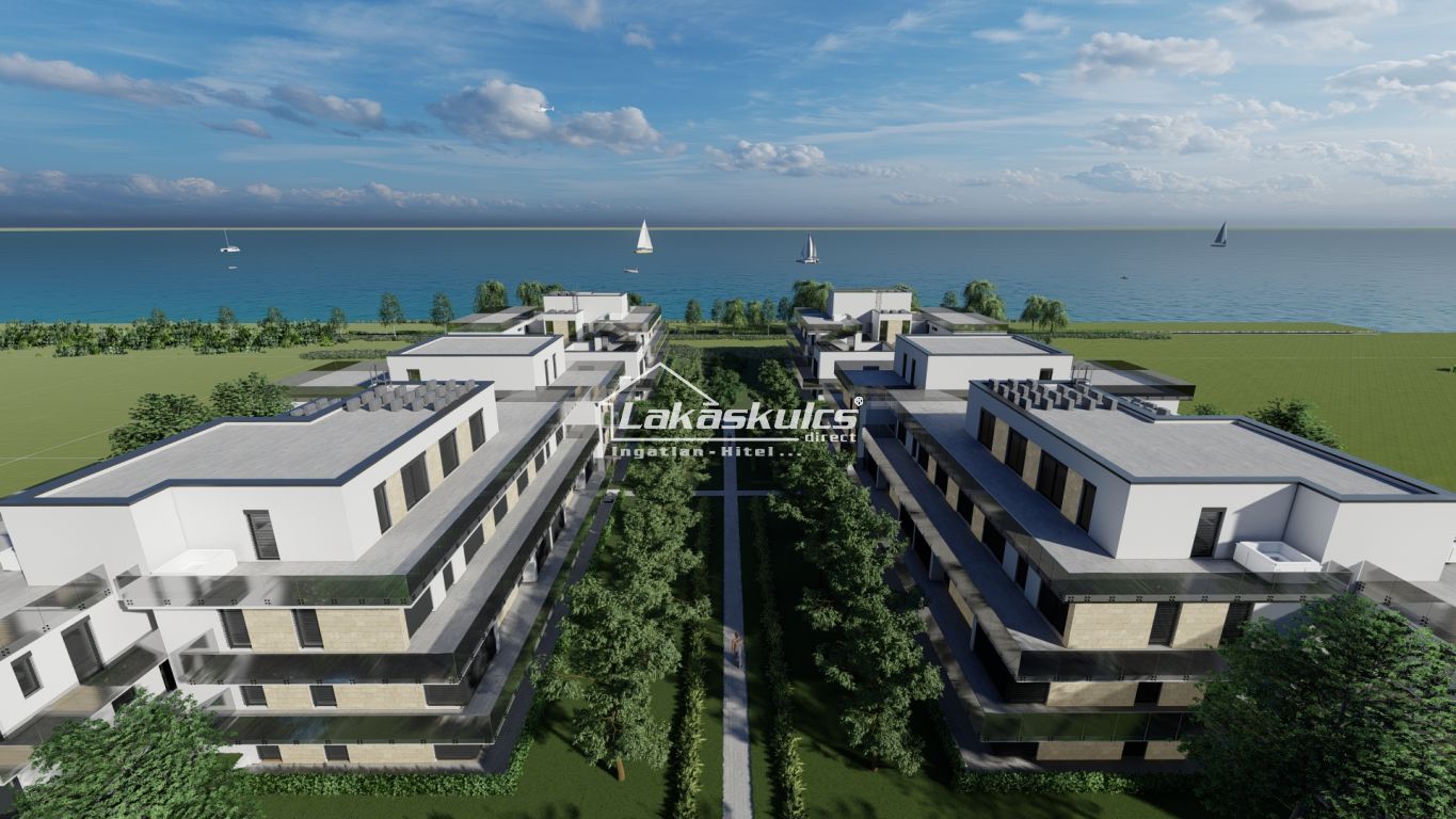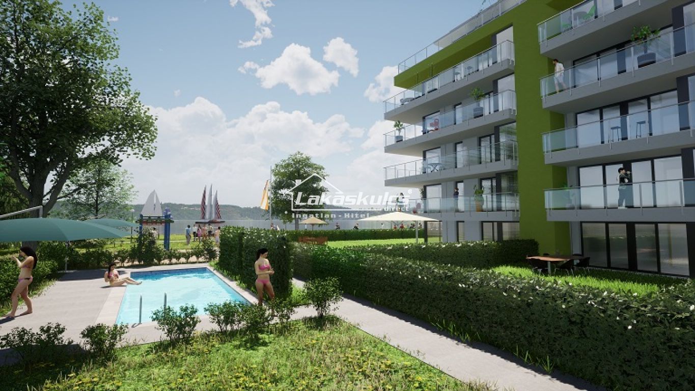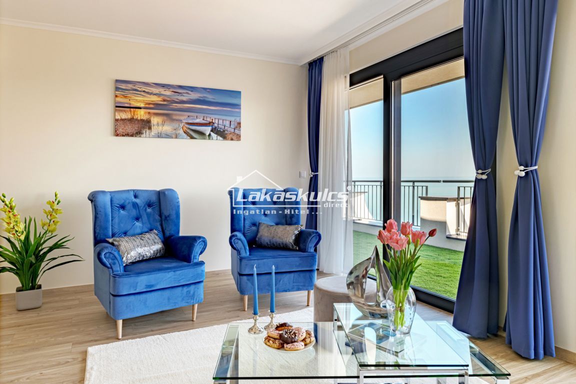 A LAKÁS FRONTI, KÖZVETLEN PANORÁMÁS, BALATONRA TÁJOLT, VÍZPARTI, KERTKAPCSOLATOS LAKÁS, gondos és alapos tervezői munka eredményeként került megvalósításra. Fontos szempont volt a praktikum, a használhatóság, a fenntarthatóság, és még sok más fontos paraméter, melyek a korábbi építkezések tapasztalatai alapján, a vevők érdekében súlyozottan lettek figyelembe véve. A lakás otthont kínál az álomszép Balaton mellett, ahol nem csak szezonálisan, de egész évben is élvezetes kényelmet, kikapcsolódást és a természet közelségét nyújtja a tulajdonosának. Ritka szép, közvetlen vízparti elhelyezkedés mellett az igényes tervezés, a minőségi kivitelezés az ingatlan nagyszerű kihasználhatóságát, örök balatoni panorámát és elvehetetlen értéket biztosít. Az ötemeletes társasház tetején néhány kizárólagosan használható, panorámás grill- és napozóterasz került kialakításra úgy, hogy a lehető legnagyobb privátszférát tudja biztosítani a tulajdonosának és alkalmi vendégeinek. Itt teraszonként egyedi vízvétel és áramvétel biztosítása mellett minden lehetőség adott egy kellemes, panorámás, naplementés party élvezetéhez. A beépített anyagok kiválasztásánál a magas minőség elengedhetetlen szempont. A lakásokat elválasztó, hangszigetelt falak, az épület 15 cm vastag külső hőszigetelési rendszere, az emeletek elválasztó födémeinek 4 cm vastag hő/hangszigetelő táblái akadályozzák meg a minden irányú hangterjedést. A lakások nappalijából és szobáiból a zavartalan panoráma élvezete a teraszokon át a rozsdamentes, szálcsiszolt oszlopokkal, kapaszkodókkal és a ragasztott biztonsági üvegtáblákkal biztosított. Az emeleti szintek kényelmes megközelítését két (nyolc- és tizenháromszemélyes) lift teszi lehetővé. A nyílászárók üvegezése háromrétegű, a külső oldalakon antracit színű kerettel, a közös terek, folyosók, a teraszok I.osztályú szürke, fagyálló kőporcelán lapokkal burkolt. A lakások fűtését és hűtését központi LG Multi V-5 hőszivattyús rendszer látja el a 2024-as év energia szabványainak megfelelően, amely fokozottan energiahatékony üzemeltetést tesz lehetővé. A szobákban, nappalikban felszerelt beltéri egységek léghűtést és légfűtést biztosítanak, így ennek köszönhetően rendkívül gyorsan hűtik le vagy fűtik fel a helyiségeket. A társasház lakói kizárólagos kerthasználatot kapnak erre a területre, ahol a több generációs családok kikapcsolódása érdekében, a beruházás keretein belül gyermekjátszótér és kültéri medence biztosítja ezek védett használatát. Az ingatlan előtt húzódó több mint 3 km hosszú szabadstrand, gondozott zöldterületekkel, parti sétányokkal, vízi és parti sportolási lehetőséget kínáló kölcsönző helyekkel, valamint igényesen kialakított étteremmel és büfékkel szolgálja ki az itt nyaralók igényeit. A lakópark területére a biztonság érdekében egyedi azonosítás után lehet csak belépni. A további információkért és a személyes megtekintés érdekében, kérem, hívjon bizalommal, várom megkeresését!
