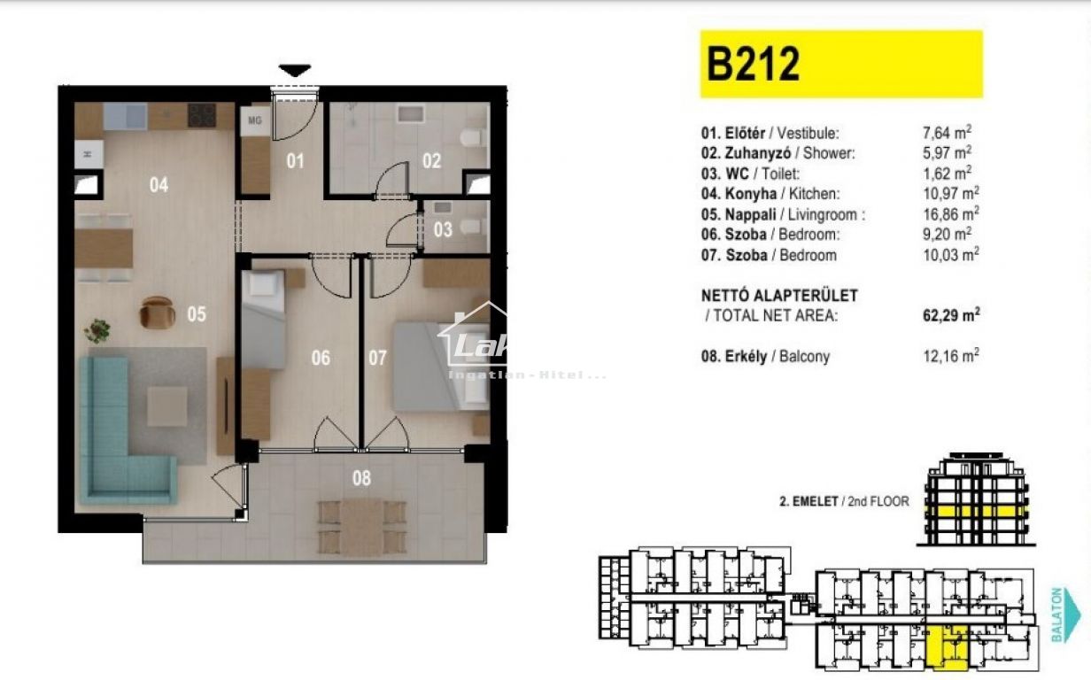 FRONTI, MÁSODIKEMELETI, ÉSZAK-KELETI FEKVÉSŰ LUXUSLAKÁS EXKLUZÍV PANORÁMÁVAL A BALATONRA ! ÚJ VÍZPARTI PROJEKT SIÓFOKON, mely második otthont kínál a Balaton szerelmeseinek. FRONTI, Észak-keleti tájolású lakás, 3 hálószobával és amerikaikonyhás nappalival. Lakás mérete: 61.81 m²Terasz: 22.19 m² Akár egész évben élvezhetik a korszerű apartmanok kényelmét és a természet közelségét. A lakások közvetlen vízparti elhelyezkedése, az igényes tervezés, a minőségi kivitelezés a garanciája az apartmanok remek kihasználhatóságának és értékállóságának. Az épület Balatonra merőleges elhelyezkedése biztosítja a lakások örök balatoni panorámáját. A társasház tetején 18 külön megvásárolható exkluzív panorámás grill és napozó tetőterasz kerül kialakításra privátszférát biztosítva tulajdonosainak és vendégeinek. Itt biztosított az egyedi víz- és áramvétel, hogy lehetőséget adjon kellemes, panorámás, naplementés party programhoz. A falak kiváló hangszigetelése, az épület külső falainak hőszigetelési rendszere, a szintek közti födémek hő/hangszigetelő rendszere, és a beépítendő anyagok kiválasztása során elengedhetetlen szempont volt a magas minőség. A lakások nappalijából és hálószobáiból a csodás panoráma élvezetét ragasztott biztonsági üvegtáblás korlátok beépítése biztosítja. Az emeletek kényelmes megközelítését 2 db 8 személyes és egy 13 személyes lift szolgálja. A nyílászárók 3-rétegű üvegezéssel készülnek, külső/belső oldalon antracit/fehér színben. A közös területeket, folyosókat, teraszokat I. osztályú szürke, fagyálló kőporcelán lapokkal burkolják. A lakások fűtését és hűtését központi LG Multi V-5 hőszivattyús rendszer látja el a 2023-as év energetikai szabványainak megfelelően, amely valóban kivételes energiahatékony üzemeltetést tesz lehetővé. A szobákba és a nappalikba beszerelt beltéri készülékek a hűtést és fűtést egyaránt biztosítják, és rendkívül gyorsan hűtik le vagy fűtik fel a helyiségeket. A telken a későbbiekben a több generációs családok kikapcsolódása érdekében, a beruházás keretein belül gyermekjátszóteret és kültéri medencéket terveznek megépíteni. Az ingatlan előtt húzódó több mint 3 km hosszú szabadstrand, gondozott zöldterületekkel, parti sétányokkal, sportolási lehetőséget kínáló kölcsönző helyekkel, valamint igényesen kialakított büfékkel szolgálja ki az itt nyaralók igényeit. A lakópark területére a biztonság érdekében egyedi azonosítás után lehet csak belépni. A LAKÁSOKHOZ FELSZÍNI AUTÓBEÁLLÓ ÉS AZ ÉPÜLETBEN TÁROLÓ VÁSÁROLHATÓ. További információ: Pervein Magdolna / Tel.: +36 20 248 9824 E-mail: pervein.magdolna@lakaskulcs.hu